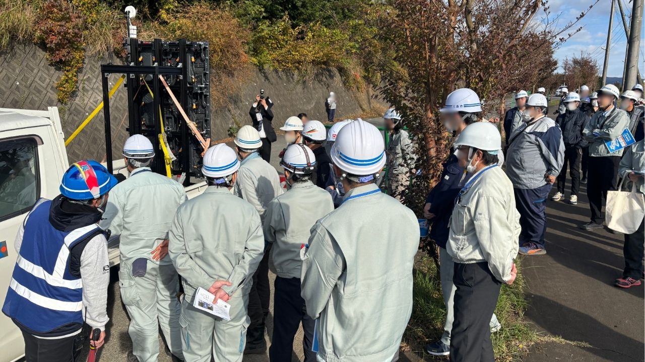 当日は、当社よりシステムの基本構造や導入による効果、安全性向上の実例について説明するとともに、実際の現場環境におけるデモンストレーションを行いました。三島市職員の皆さまをはじめ、施工会社の土木部職員など、約50名の関係者にご参加いただき、AIを用いた交通誘導の有効性や運用イメージについて理解を深めていただく機会となりました。